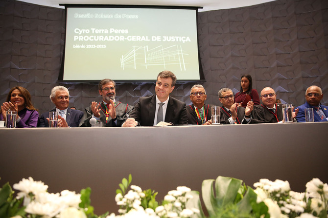 O promotor de Justiça Cyro Terra Peres tomou posse ontem, dia 8, no cargo de procurador-geral de Justiça do Ministério Público de Goías (MPGO). Ele ficará à frente da Instituição pelo biênio 2023/2025, no lugar de Aylton Flávio Vechi, que conduziu o MP goiano nos últimos quatros anos. Vechi, que é vice-presidente da Região Centro-Oeste do Conselho Nacional dos Procuradores-Gerais do Ministério Público dos Estados e da União (CNPG), representou a presidente do colegiado, a PGJ da Bahia Norma Cavalcanti, na cerimônia. A sessão solene de posse foi realizada no final da tarde no Auditório Carlos Vieira, da Assembleia Legislativa de Goiás, com a presença de diversas autoridades, entre elas o governador do estado Ronaldo caiado.