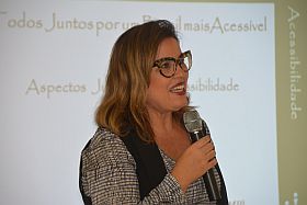 Ela abordou o conceito de adaptação razoável, requisitos para acessibilidade, barreiras de comunicação, sinalização, além de estudos de caso.
