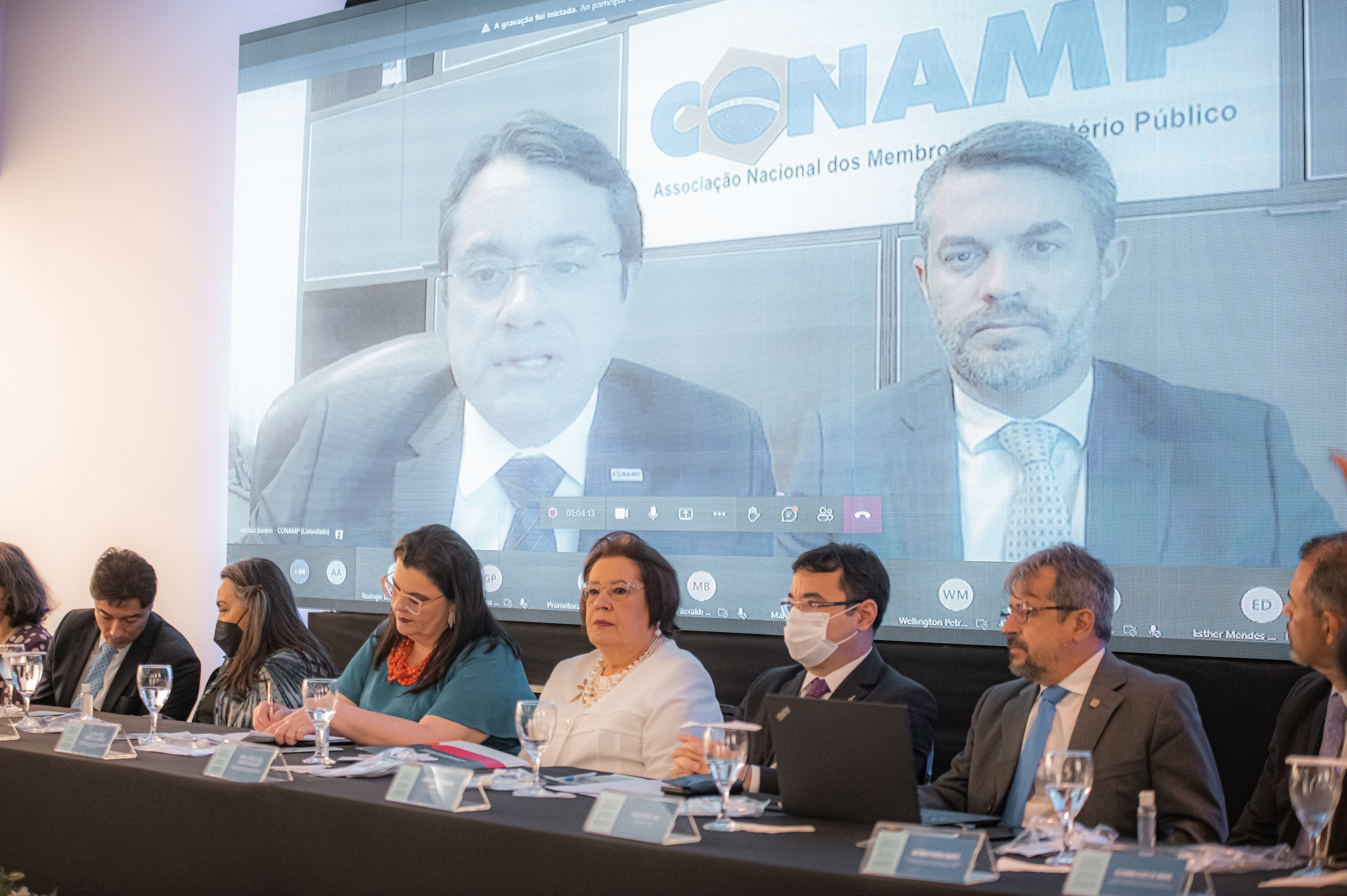 Além das presidentes do CNPG e do GNDH e GNDC, compuseram a mesa de solene da abertura do evento o governador do Estado do Espírito Santo, Renato Casagrande; o corregedor Nacional do Ministério Público, Oswaldo D’Albuquerque; o procurador-geral de Justiça do Ministério Público do Estado do Piauí (MPPI) e presidente eleito do Grupo Nacional de Direitos Humanos, Cleandro Moura; o procurador-geral de Justiça Militar e vice-presidente do GNDH, Antônio Pereira Duarte; os conselheiros do CNMP Rinaldo Reis Lima e Moacyr Rey Filho; a presidente da Associação Brasileira de Mulheres de Carreiras Jurídicas do Espirito Santo e procuradora de Justiça do MPES, Catarina Cecin Gazele; o presidente do Tribunal Regional Eleitoral do Espírito Santo (TRE-ES), desembargador José Paulo Calmon Nogueira da Gama; e a secretária de Estado de Direitos Humanos, Nara Borgo. Compuseram a mesa de forma virtual o presidente em exercício da Associação Nacional de Membros do Ministério Público (Conamp), Tarcísio José Sousa Bonfim, e o presidente da Associação Espírito-Santense do Ministério Público, promotor de Justiça Pedro Ivo de Sousa.