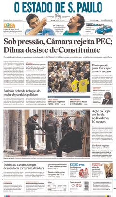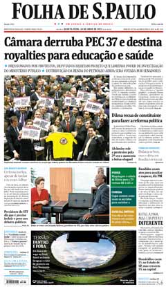 Na manhã desta quarta-feira (26), os jornais de todo País trouxeram estampados em suas capas o arquivamento da Proposta de Emenda Constitucional (PEC) 37. A proposta que foi votada, e com 430 votos, rejeitada na noite dessa terça-feira (25), foi destaque nos principais veículos de circulação impressos, como o Correio Braziliense, O Globo, Folha de S. Paulo, Zero Hora, O Estado de S. Paulo, Folha de Pernambuco, entre outros.