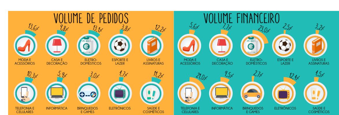 Quanto ao volume de pedidos, moda e acessórios, eletrodomésticos e livros/assinaturas/apostilas estão entre os produtos mais vendidos de 2016. Em relação ao volume financeiro, porém, eletrodomésticos, telefonia/ celulares e eletrônicos foram os que movimentaram mais dinheiro.